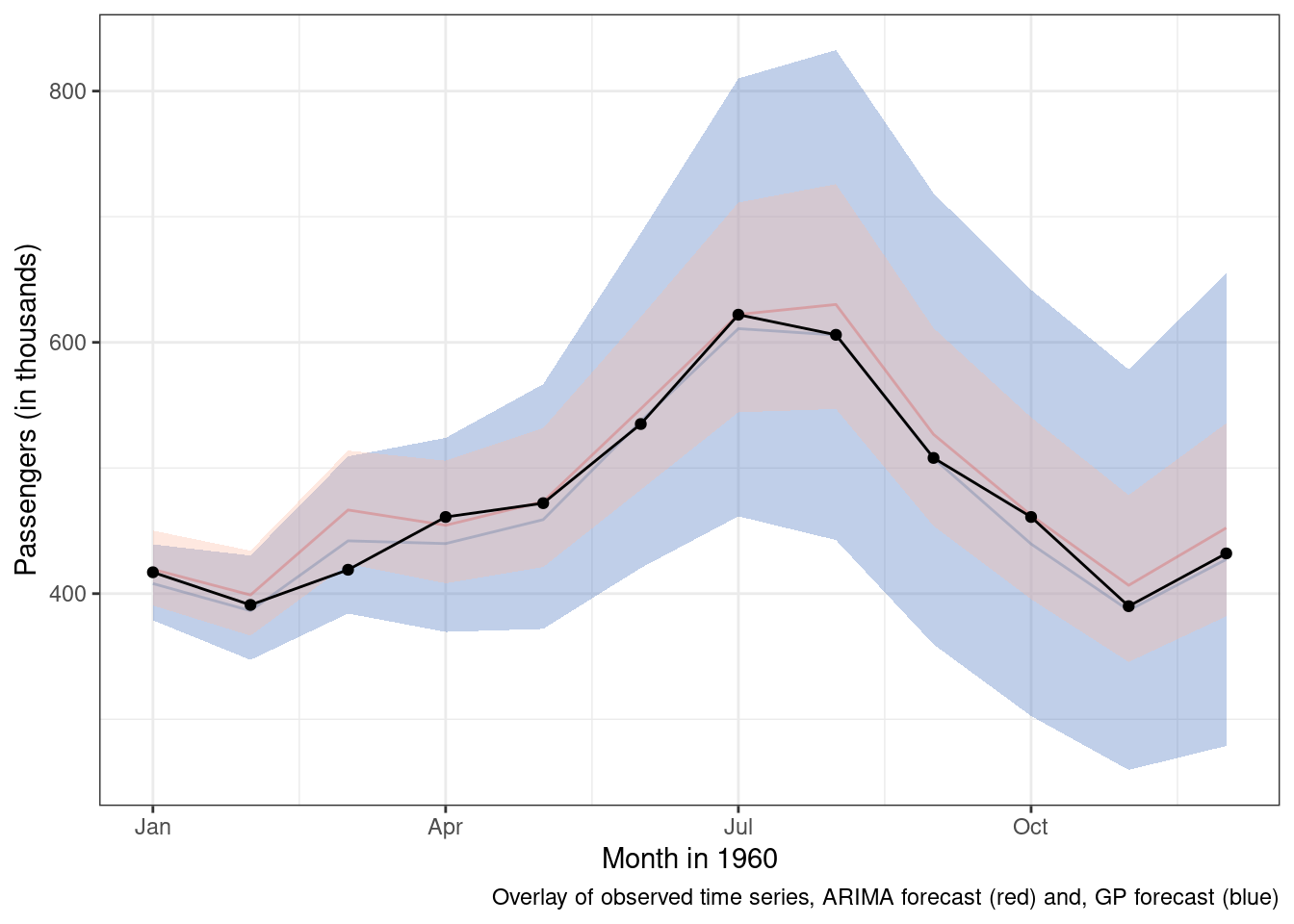 This post has reviewed how to build a Gaussian process model to forecast an outcome of interest (monthly passengers) using only historical data measured at equal intervals over time. Hopefully, you are convinced that, with some oversight and judicious modeling, Gaussian processes can be combined to make effective time-series forecasts. The modeling technique is incredibly flexible, and, if there is a pattern that is discernible in the time-series, there is a Gaussian process and kernel function that can be used to represent it.
